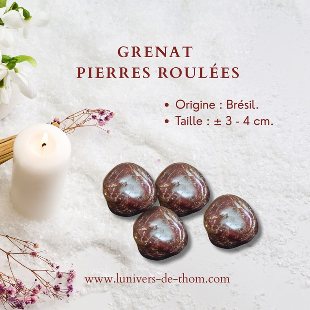 Pierre d'une grande dureté formée dans les profondeurs de la Terre, le Grenat est reconnu pour stimuler l'instinct de survie et la volonté. Véritable source d'énergie, il agit comme un contrepoids aux sentiments de découragement en favorisant le courage, l'optimisme et l'espoir.